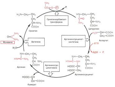 Синтез мочевины происходит в печени в цикле Кребса-Гензелейта (другое название - орнитиновый цикл мочевинообразования Кребса) в несколько этапов с участием ряда ферментных систем. Синтез сопровождается поглощением энергии, источником которой является АТФ.
