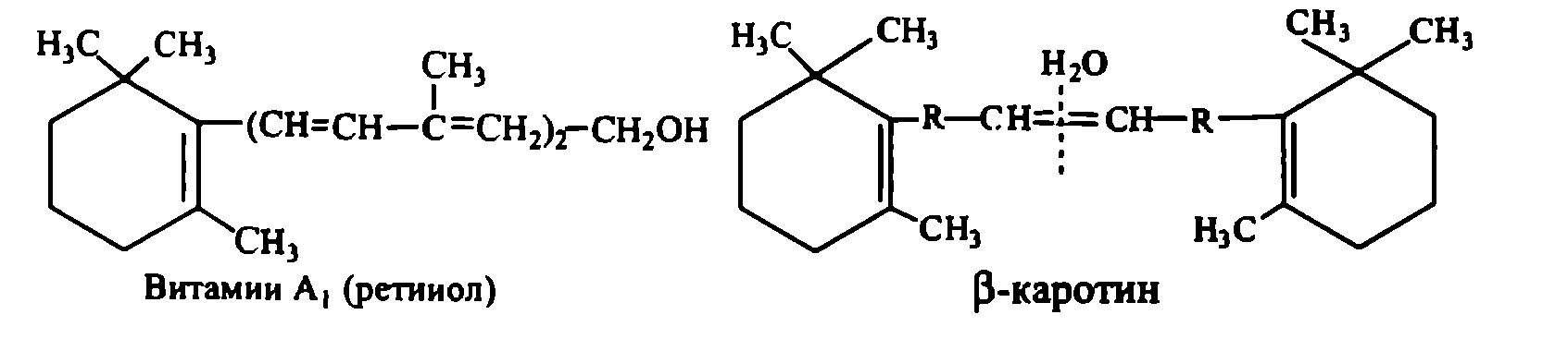 Химическая структура. Витамин А, (ретинол) и витамин А2 (дегидроретинол) - производные (3-ионона. В моркови содержится провитамин Р-каротин, который гидролизуется в слизистой кишечника на 2 молекулы витамина А,.