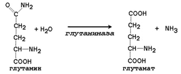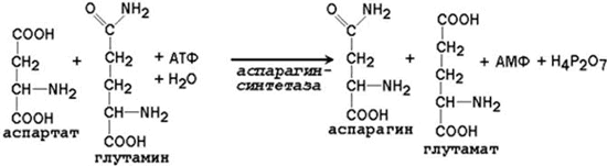 Аспарагин аналогичным образом подвергается гидролизу при участии аспарагиназы, присутствующей в клетках канальцев почек.