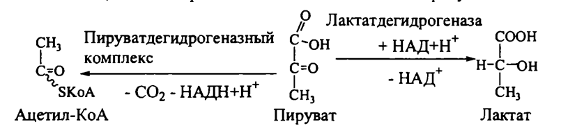 В анаэробных условиях пируват под действием лактатдегидрогеназы (ЛДГ) восстанавливается до молочной кислоты. Коферментом ЛДГ является НАД+. Последний восстанавливается до НАДН+Н* при окислении глицеральдегидфосфата и используется для превращения пирувата в лактат, т.е. идет процесс гликолитической оксидоредукции.