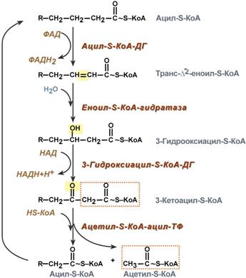 Процесс собственно β-окисления состоит из 4-х реакций,последовательно происходит окисление (ацил-SКоА-дегидрогеназа), гидратирование (еноил-SКоА-гидратаза) и вновь окисление 3-го атома углерода (гидроксиацил-SКоА-дегидрогеназа). В последней, трансферазной, реакции от жирной кислоты отщепляется ацетил-SКоА. К оставшейся (укороченной на два углерода) жирной кислоте присоединяется HS-КоА, и она возвращается к первой реакции. Все повторяется до тех пор, пока в последнем цикле не образуются два ацетил-SКоА.