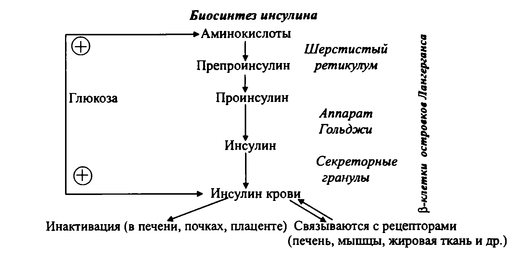 Регуляция секреции инсулина. Концентрация инсулина в крови увеличивается при увеличении содержания глюкозы и наоборот, а также Са:+, некоторых аминокислот и ц-АМФ. При хроническом влиянии избыточных количеств гормонов роста, кортизола, плацентарного лактогена секреция инсулина повышается (поздние сроки беременности). Производные сульфонилмочевины стимулируют секрецию инсулина. Период полужизни инсулина - 3-5 минут. Метаболизм инсулина происходит в печени, почках, плаценте с помощью инсулин-специфической протеиназы (инсулиназы) и глутатион-инсулин-транс-гидрогеназы.