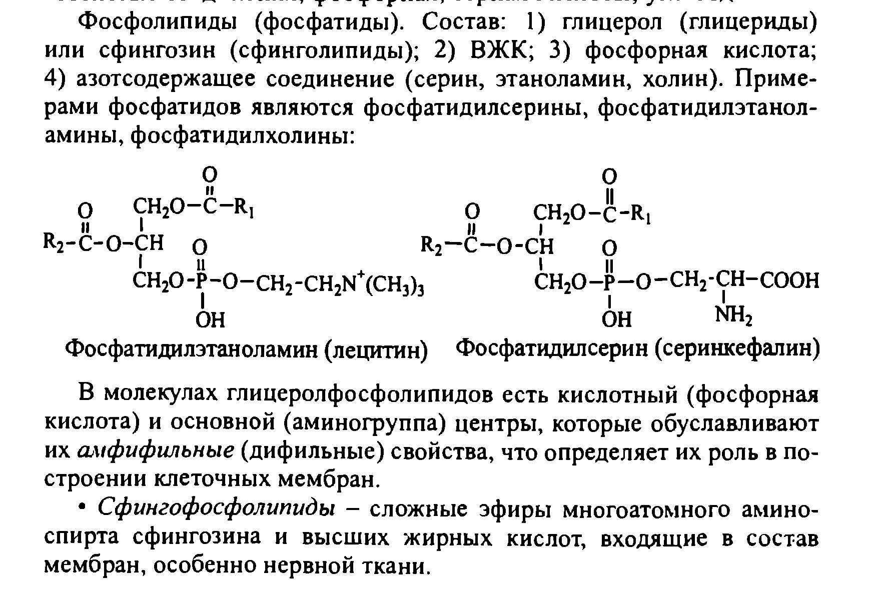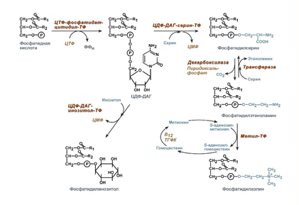 Центральную роль в биосинтезе фосфолипидов играют 1,2-диглицериды (в синтезе фосфатидилхолинов и фосфатидилэтаноламинов), фосфатиднаякислота (в синтезе фосфатидилинозитов) и сфингозин (в синтезе сфин-гомиелинов). Цитидинтрифосфат (ЦТФ) участвует в синтезе практически всехфосфолипидов. В качестве примера рассмотрим синтез отдельных представителей фосфолипидов.