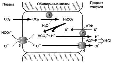 Основная пищеварительная функция желудка заключается в том, что в нём начинается переваривание белка. Существенную роль в этом процессе играет соляная кислота. Белки, поступающие в желудок, стимулируют выделение гистамина и группы белковых гормонов -гастринов (см. раздел 11), которые, в свою очередь, вызывают секрецию НСI и профермента - пепсиногена. НСI образуется в обкладочных клетках желудочных желёз в ходе реакций, представленных на рис. 9-2.