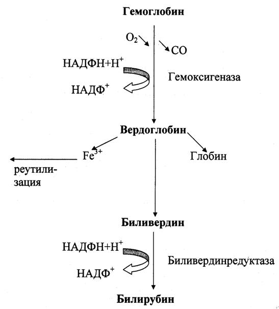 Основная часть желчных пигментов образуется при распаде гема и гемоглобина в клетках ретикулоэндотелиальной системы (РЭС) и представляет собой многоступенчатый процесс: при окислении гемоглобина образуется вердоглобин; после отщепления глобина и железа образуется биливердин, который далее восстанавливается до билирубина.