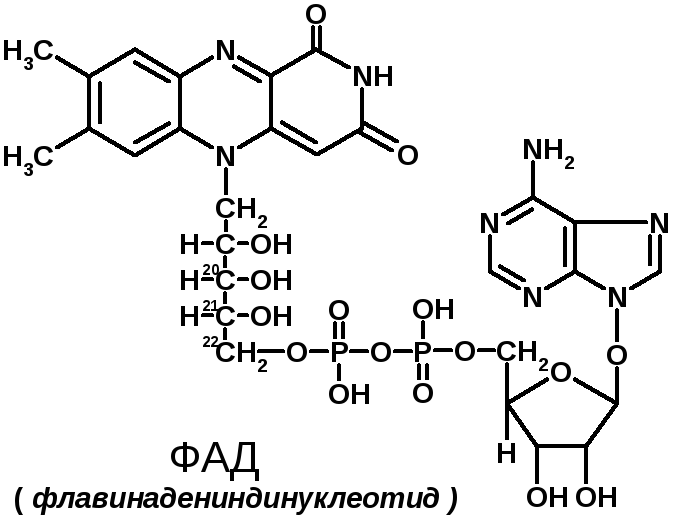 Сюда относят:флавинмононуклеотид (ФМН); флавинадениндинуклеотид (ФАД).Ребитол и изоалоксазин образуют витамин В2. Витамин В2 и остаток фосфорной к-ты образуют ФМН
