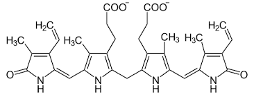 Билирубин — желто-красный пигмент, представляющий собой линейный тетрапиррол, токсичное, жирорастворимое вещество, способное нарушать окислительное фосфорилирование в клетках, в первую очередь в нервной ткани. В крови билирубин либо находится в свободном состоянии, либо в комплексе с альбумином (частично в виде альбумин-фосфатидного комплекса), в меньшем количестве — в комплексах с металлами, аминокислотами, пептидами и другими малыми молекулами. Образование таких комплексов предотвращает выделение билирубина с мочой. Такая форма билирубина называется свободной (неконъюгированной, несвязанной, непрямой). Она не дает прямой реакции с диазореактивом Эрлиха.