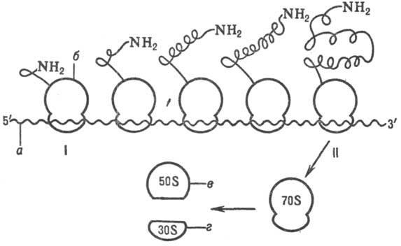 Рибосомный синтез белка-многоэтапный процесс. Первая стадия (инициация) начинается с присоединения матричной РНК (мРНК) к малой рибосомной субчастице, не связанной с большой субчастицей.