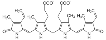 4. Билирубин — желто-красный пигмент, представляющий собой линейный тетрапиррол, токсичное, жирорастворимое вещество, способное нарушать окислительное фосфорилирование в клетках, в первую очередь в нервной ткани. В крови билирубин либо находится в свободном состоянии, либо в комплексе с альбумином (частично в виде альбумин-фосфатидного комплекса), в меньшем количестве — в комплексах с металлами, аминокислотами, пептидами и другими малыми молекулами. Образование таких комплексов предотвращает выделение билирубина с мочой. Такая форма билирубина называется свободной (неконъюгированной, несвязанной, непрямой). Она не дает прямой реакции с диазореактивом Эрлиха.