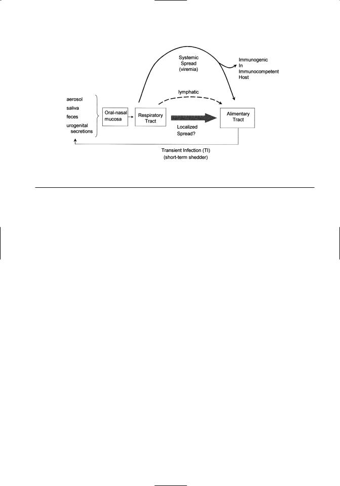 Figure 6.2. Schematic depicting the spread of BVDV in secretions and excretions during a transient infection (TI). Three modes of virus dispersal within the animal’s body are noted. These include lymphatics, viremia, and localized spread via the alimentary tract.