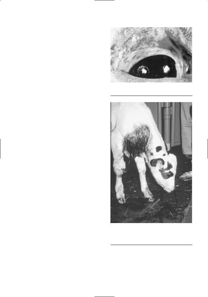 leaves approximately 15% of the population at risk at the time of initial breeding. It is estimated that BVDV causes about 6–10% of infectious abortions in cattle (Figure 6.3; Dubovi, 1994). Although this infection may result in serious reproductive losses in a few herds, the predominant form of infection with BVDV is the congenital infection (Muñoz-Zanzi et al., 2003). The fetus is highly susceptible between 45 and 125 days of gestation (Dubovi, 1994). Calves infected during this time are at high risk of developing fetal abnormalities that may affect the brain (cerebellar hypoplasia), eyes (retinal atrophy, cataracts), growth retardation with arrested bone development, and pulmonary hypoplasia. Another form of congenital defect is immune tolerance, in which the developing fetus becomes infected with a noncytopathic strain (see Chapter 3) of BVDV between 90 and 120 days (Figure 6.4). The immune system develops tolerance to the infecting strain of BVDV. The result is that no immune response to the virus is mounted by the fetal immune system and the fetus becomes persistently viremic or persistently infected (PI). Figure 6.1 depicts the clinical manifestations of BVDV, with particular attention on the propagation of BVDV PI offspring (see Chapter 7). Following birth, the PI calf is vulnerable to developing mucosal disease (MD) by one of several mechanisms (Figure 6.5).