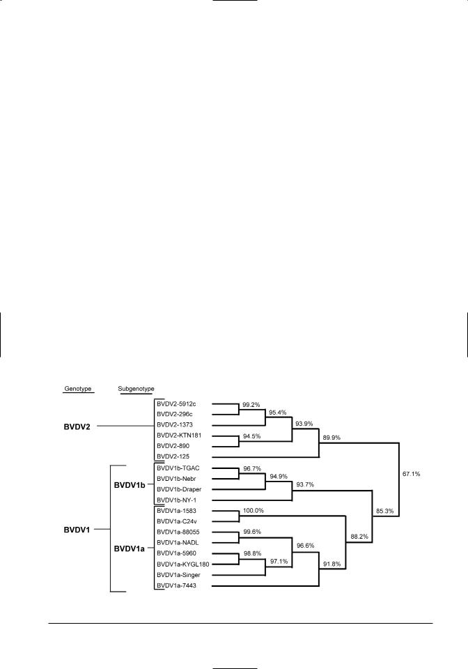 Figure 13.1. Dendogram representing the relatedness of nucleotide sequences from reference BVDV 1a, BVDV 1b, and BVDV 2 strains.