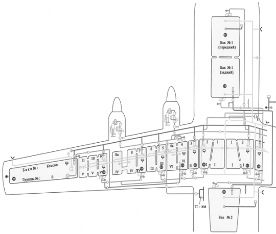 Баки системы (34шт.), объединены в 12 групп по 6 в правой и левой половинах крыла, по одному бак-кессону в каждой консоли крыла и 3 подпольных дополнительных топливных бака.