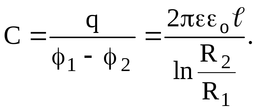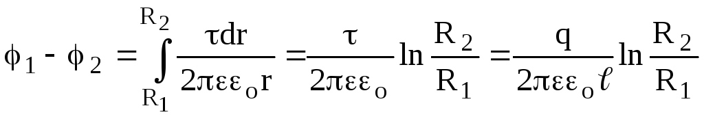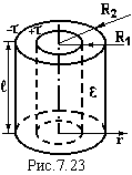 Приклад 3. Ємність циліндричного конденсатора (рис.7.23). Це два коаксіальних циліндри. Із (7.27), враховуючи (7.22) і (7.6) знайдемо різницю потенціалів між циліндрами.