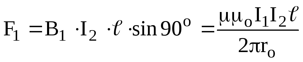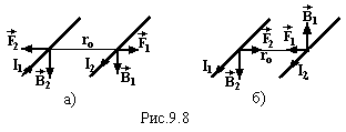 Розглянемо взаємодію двох нескінченних паралельних прямолінійних провідників із струмами І1 і І2, які знаходяться на відстані ro один від одного. Така взаємодія відбувається через магнітне поле: кожний провідник створює магнітне поле (9.13), яке потім діє на інший провідник (рис.9.8) з силою Ампера (9.1).