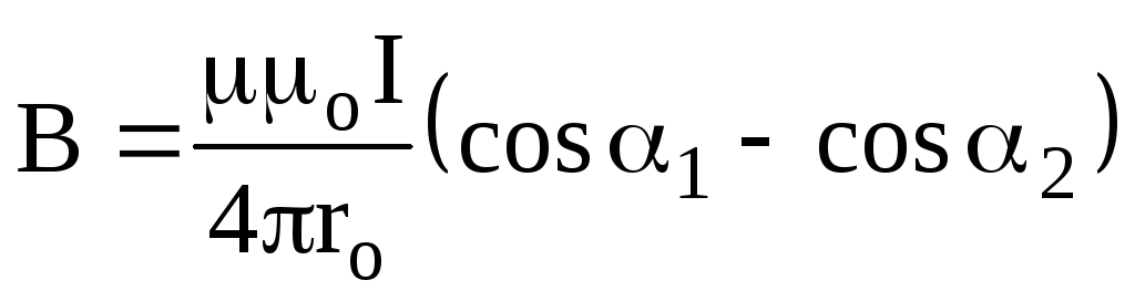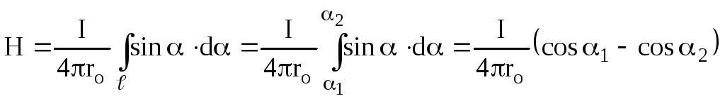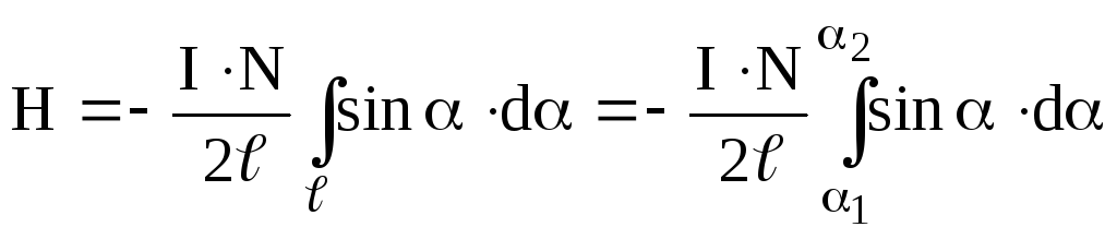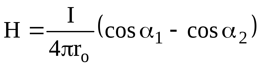 Тут α1 і α2 – кути, під якими видно кінці соленоїда із точки, в якій розраховується напруженість. Таким чином одержуємо