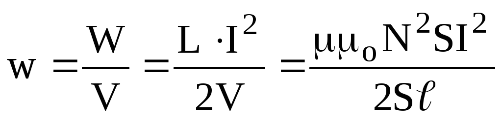Знайдемо її на прикладі магнітного поля довгого соленоїда (рис.9.14). Якщо нехтувати крайовими ефектами, то це поле зосереджене всередині котушки, а отже відомий об’єм V = S∙ℓ. Енергію знаходимо по (9.46) з врахуванням (9.41). Одержуємо