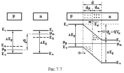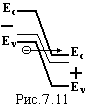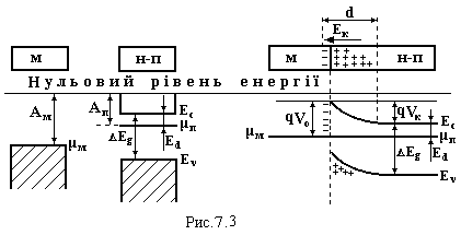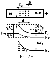 Напруженість контактного електричного поля направлена від напівпровідника в метал, а по величині (Ек = Vк/d ≈ 3106 В/м) набагато менша від напруженості внутрішнього поля кристалу напівпровідника (~108 В/м). Тому в області контакту структура енергетичних зон напівпровідника не змінюється, а енергетичні рівні зазнають викривлення, в нашому випадку загинаються вверх. Упевнимось у цьому такими міркуваннями. Нехай нам потрібно перемістити електрон через контакт із об’єму напівпровідника в метал. Для цього ми повинні рухати його в напрямку напруженості контактного поля ЕК, яке буде перешкоджати такому рухові. Дійсно, оскільки заряд електрона від’ємній, на нього діє сила, направлена проти вектора напруженості електричного поля. Отже ми повинні виконати певну роботу, яка перетворюється в потенціальну енергію електрона. А це й означає загинання енергетичних зон вверх, що і відображено на рис.7.3.