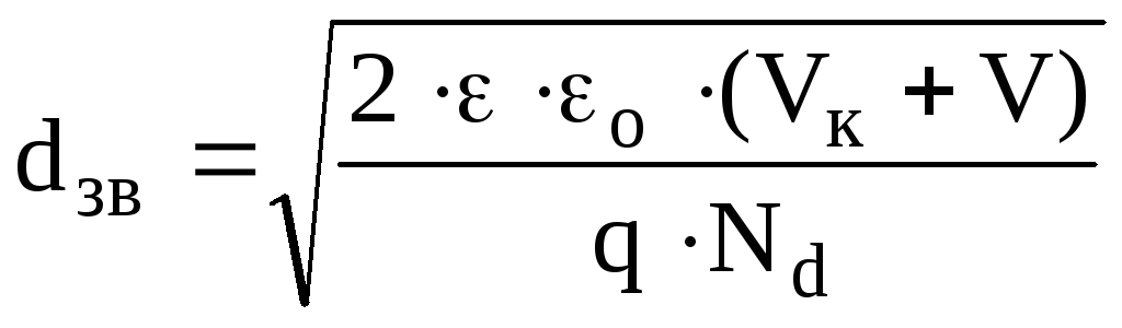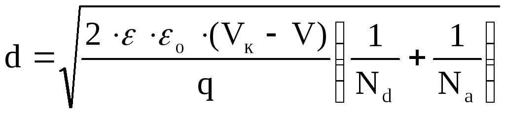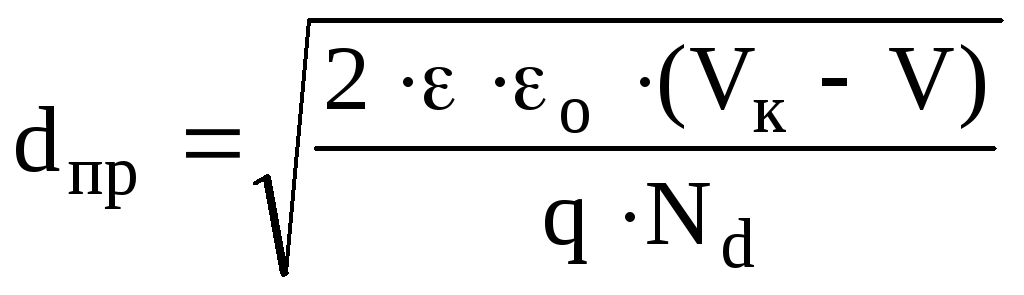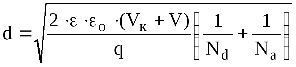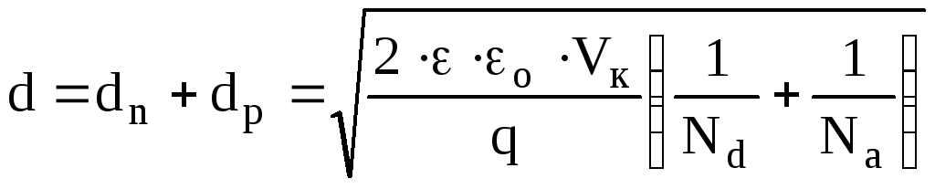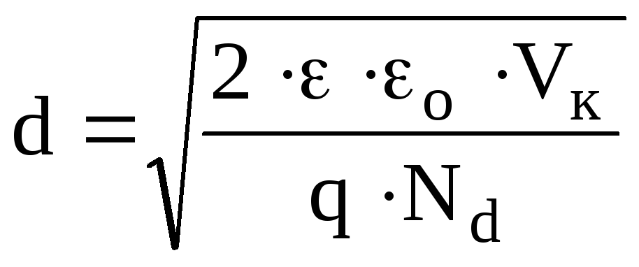 Нехтуючи товщиною контактного шару в металі в одну міжатомну відстань, можемо вважати, що вся контактна область поширюється в напівпровідник. Із формули (7.4), враховуючи, що кількість електронів, які зазнають переходу, дорівнює концентрації донорної домішки Δn = Nd, знаходимо товщину контактного шару