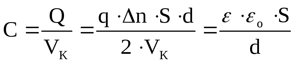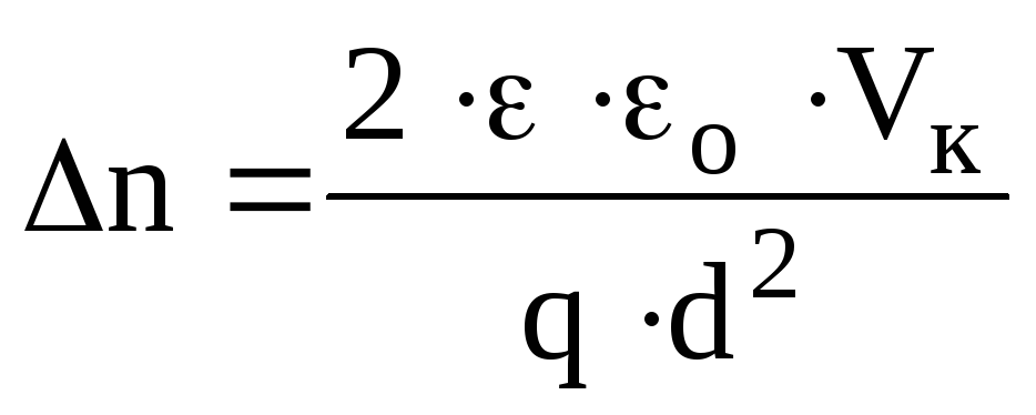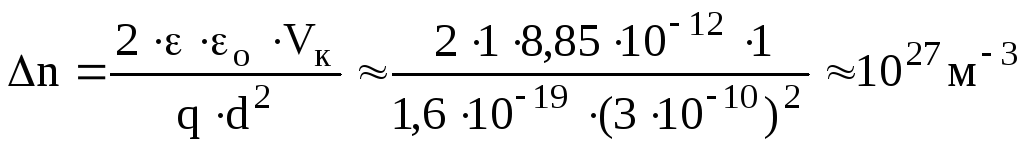 Для кількісної оцінки максимально можливого значення Δn приймемо мінімально можливе значення d = 310-10м, що складає приблизно одну міжатомну відстань, ε = 1, εо = 8,8510-12 Ф/м, VК = 1 В.