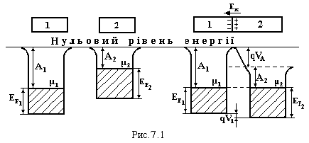 Розглянемо два метали з різними роботами виходу електронів А1 і А2, а також різними енергіями Фермі ЕF1 і EF2. Зонні діаграми показані на рис.7.1. (див. розділ 2.4)
