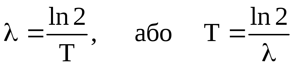 Час Т, за який розпадається половина всіх радіоактивних атомів, називається періодом піврозпаду. Для різних елементів він різний і лежить в межах від 310-7 сек. до 51015 років. Знайдемо зв’язок між періодом піврозпаду Т і сталою розпаду λ. Для цього у (9.14) підставимо t = T, N=0,5No. Одержуємо