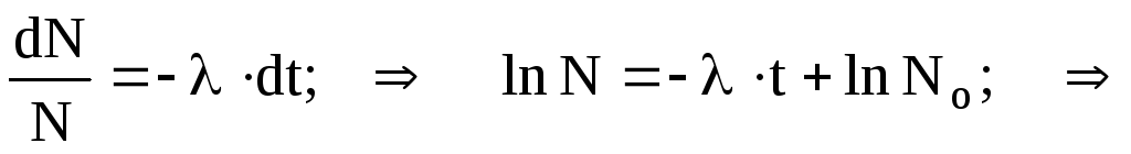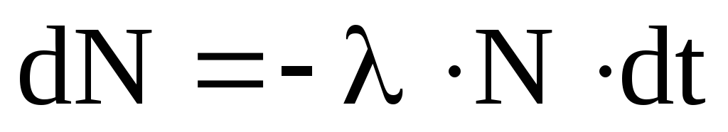 Знайдемо закон зміни з часом кількості атомів, що зазнали радіоактивного перетворення. Нехай спочатку маємо Nо радіоактивних атомів. Очевидно, що кількість dN атомів, які розпадаються за час dt буде пропорційна цьому часові і кількості N атомів, які на цей момент ще не розпалися