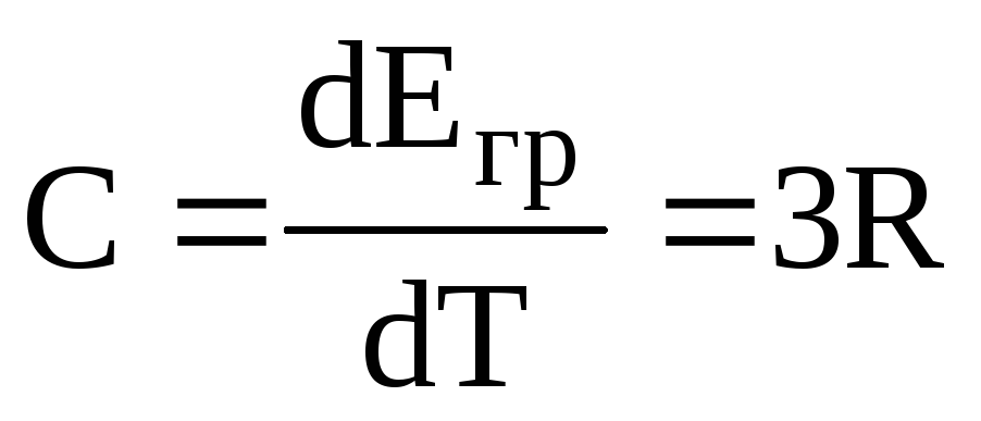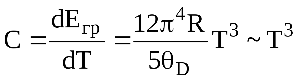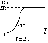 В області низьких температур молярна теплоємність пропорційна кубу абсолютної температури (3.13). Це закон Дебая (див. рис.3.1), який добре узгоджується з експериментом .