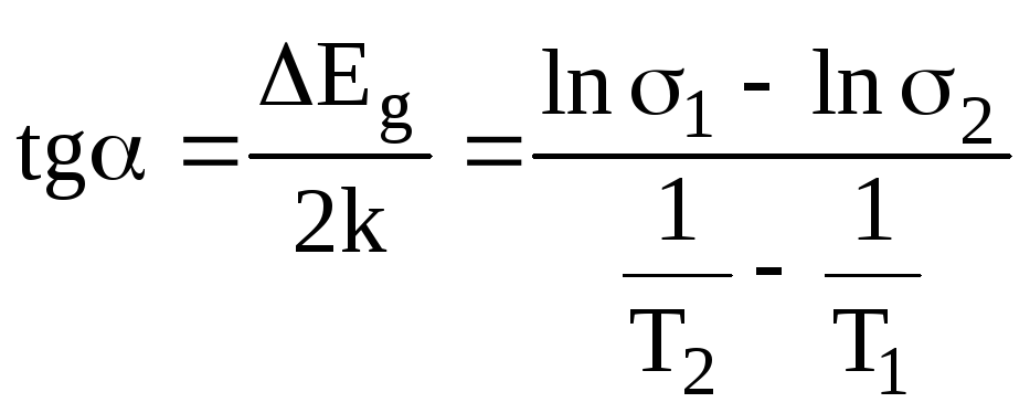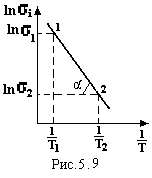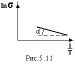 Графік температурної залежності домішкової електропровідності (рис.5.11) зображають у таких же напівлогарифмічних координатах, як і власну електропровідність (див. рис.5.9). Нахил графіка дає можливість знайти енергію активації домішкових атомів ЕD чи EA.
