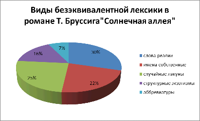 Согласно рис. 1, в романе выявлены такие виды безэквивалентной лексики как слова-реалии, имена собственные, случайные лакуны, структурные экзотизмы и аббревиатуры. Виды безэквивалентной лексики также неоднородны по своему количественному составу. Таким образом, 24 примера составляют слова-реалии, это максимальный показатель, в то время как аббревиатуры насчитывают всего 6 примеров. Процентное соотношение представлено в таб. 1.