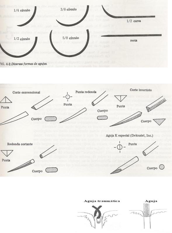 En cuanto a la curvatura, las agujas muy curvas (círculo) se emplean para suturas de profundidad y las poco curvas (1/3 de circulo) así como las rectas, se usan para suturas superficiales.
