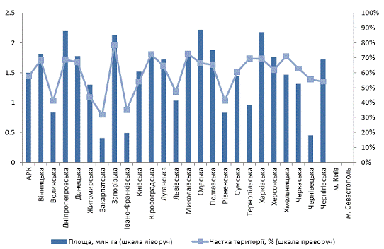 Найбільшою частка такої землі є Запорізькій області (78,5%). У Миколаївській області частка землі, яка призначена для аграрного виробництва, займає 72,6% території, у Кіровоградській - 72,3%, у Хмельницькій - 71,0%. Ще у восьми регіонах частка сільськогосподарської землі становить 53,9-64,5%, що є близьким до середнього рівня (Автономна республіка Крим, Київська, Луганська, Сумська, Херсонська, Черкаська, Чернівецька та Чернігівська області).