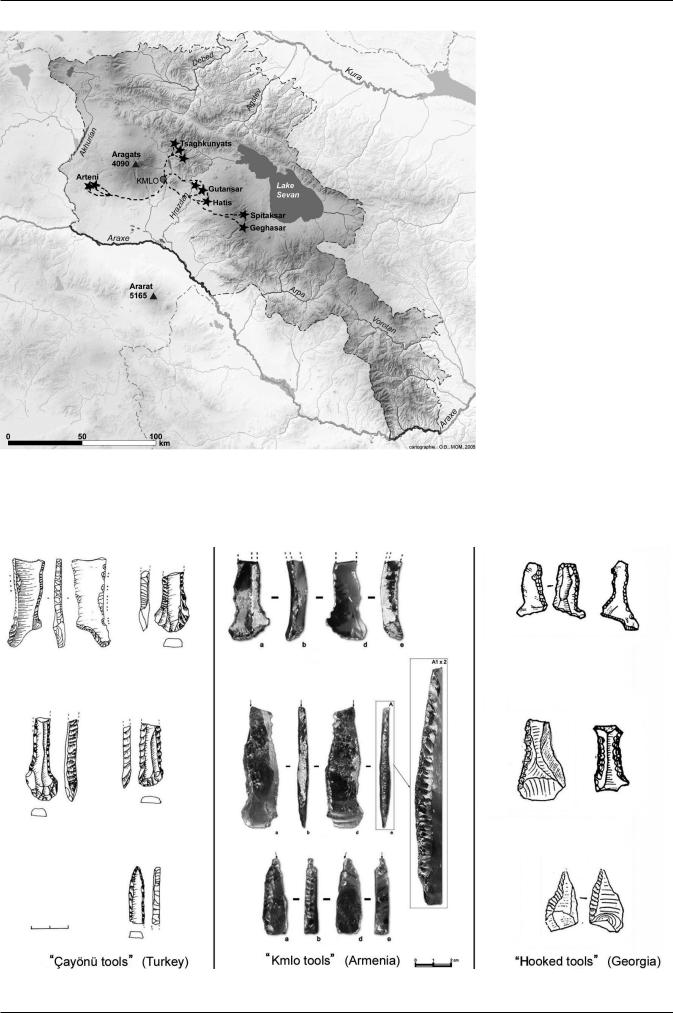 In Georgia, similar tools, called “hooked tools”, characterise a culture attributed to the early Neolithic, the Palu- ri-Nagutnyj culture, that developed on the southwestern slopes of the Greater Caucasus (Grigolija 1977). Similar tools are also found on the high plateaus of southern Georgia (“Paravani group”), where the large obsidian deposit of Chikiani was exploited (Kiguradze and Menadbe 2004: 353-357). Most of these Georgian Early Neolithic sites are found at altitude, several are rock shelters, and all have produced only one level of occupation; unfortunately, none