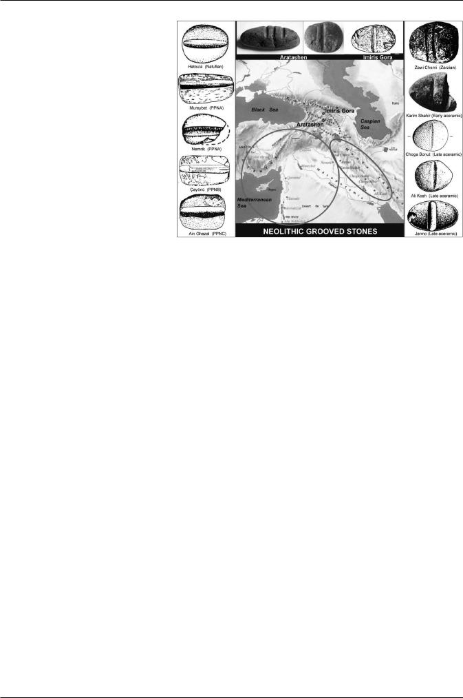 mi, Karim Shahir, Jarmo, etc.), they follow more often the transverse axis (Solecki 1981; Howe 1983; Moholy-Nagy 1983). The grooved stones of Armenia could be compared to this latter variant (Fig. 6).