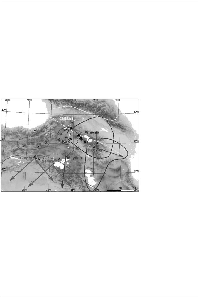 during the Neolithic and Chalcolithic periods: a) the Bingöl and Nemrut Dag sources, which spread widely throughout the Fertile Crescent, but not to the north; b) the Meydan Dag deposit north of Lake Van, which had a broad diffusion in Northern Mesopotamia and is represented in the southern Caucasus only occasionally; c) the Erzurum region, whose populations exploited only the local obsidian. In fact, the obsidian sources located in the Lake Van and Erzurum regions represent less than 1% of the provenances of all the southern Caucasian archaeological samples analysed (Badalyan et al. 2004b). The near-absence of diffusion of obsidian from the northern Near East towards the southern Caucasus and from this region towards the south is noticeable and suggests that the obsidian exchange networks elaborated by the Mesopotamian populations did not play an important role in the process of Neolithisation of the southern Caucasus.