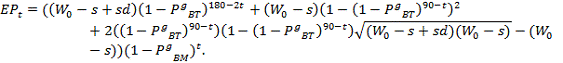 this situation the derivative of the expected payout amount that a bookmaker has to pay as a “cash out” is strictly negative what implies that the expected payout amount is strictly decreasing in time. This means that the expected payout that a bookmaker has to pay as “cash out” is at its minimum in the very end of the game, at the 90th minute. The bookmaker’s subjective expectations of the outcome are such that it is less expensive for him to wait until the end of the game hoping that someone scores than to interrupt the game and make a bettor cash out. Hence, “cash out” option will not be utilized again as a bookmaker will not desire to offer a certainty equivalent (or more) until the end of the event and the bettor will not accept any amount less of that.case shows that the bet will occur but the “cash out” will not be used again.