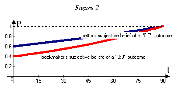 bettor’s and bookmaker’s subjective probabilities of a goal at each minute are