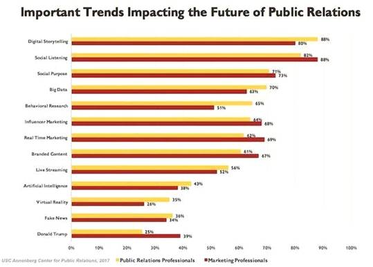 Итак, во-первых: «PR-специалисты отмечают, что сторителлинг и «слушание» в социальных сетях - те тренды, которые окажут наибольшее влияние на будущее этой сферы, отмечает недавнее исследование Национальной ассоциации рекламодателей и USC Annenberg Center for Public Relations. Исследование опросило 875 PR- специалистов (63% работают на агентство, 37% in-house) и 101 in-house маркетологов. Согласно опрошенным, digital сторителлинг -крупнейший будущий PR-тренд (88% назвали его важным). На втором месте - мониторинг социальных сетей (82%), а затем следуют социальные цели бизнеса (71%) и Big Data (70%)»47.