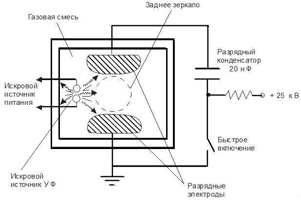 В этом случае внешнее электрическое поле имеет высокую напряженность. Чтобы обеспечить требуемый разрядный импульс, индуктивность разрядного контура должна быть как можно меньше. Для этого разрядный конденсатор фактически делают в виде разрядных безындукционных конденсаторов, смонтированных вдоль разрядной трубки как можно ближе к электродам разряда. Генерация представляет собой усиленное спонтанное излучение и лазер может работать вообще без зеркал. Но с целью уменьшения порого-