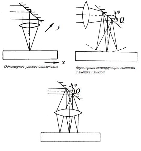 рующих системах Б-типа только центральная точка обрабатываемой поверхности находится в фокальной плоскости линзы (сканирующие системы с угловым отклонением пучка). Основные типы данных систем представлены на рис. 2.8.