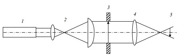 1 – лазер; 2 – расширитель пучка; 3 – маска; 4 – фокусирующий объектив; 5 – обрабатываемая поверхность
