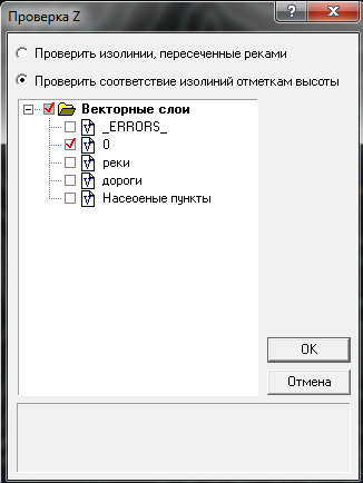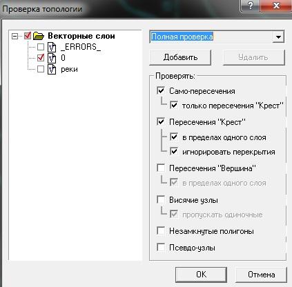 Пересечение горизонталей: Утилиты → Топология → Проверка топологии (проверяем только нулевой слой (горизонтали): «само-пересечения» и пересечения «Крест», ставим соответствующие галочки согласно рис.4)