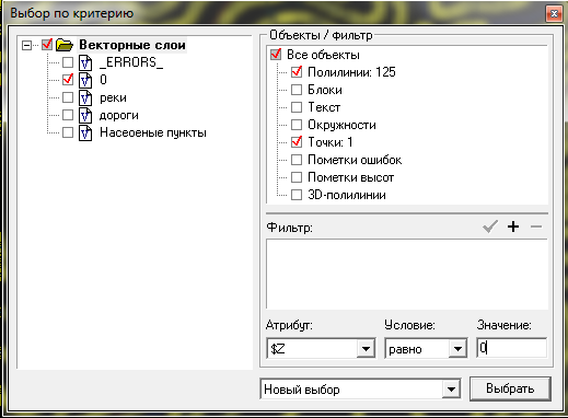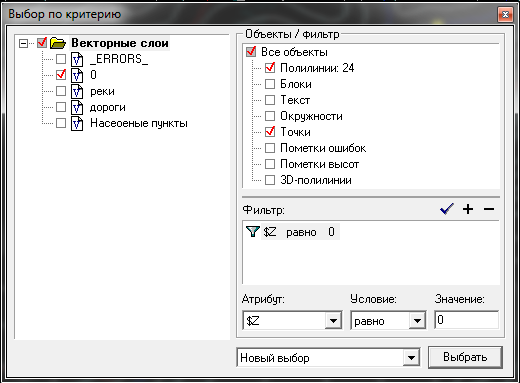 Подсветятся горизонтали, точки и отрезки, имеющие Z=0.