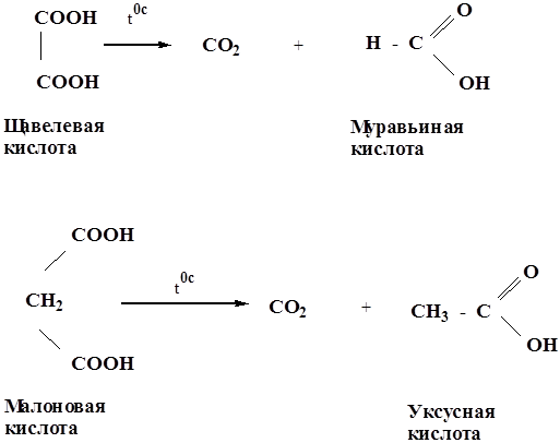 1)Реакции декарбоксилирования карбоновых кислот – энергетически выгодный процесс, т.к. в результате образуется устойчивая молекула СО2. Декарбоксилирование характерно для кислот у которых в ά-положении имеется электроноакцепторный заместитель. Легче всего декарбоксилируются двухосновные кислоты.