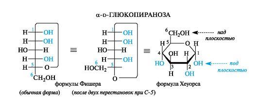 Для перехода к формулам Хеуорса циклическую формулу Фишера преобразуют так, чтобы атом кислорода цикла располагался на одной прямой с атомами углерода, входящими в цикл. Это показано ниже на примере a-d-глюкопиранозы путем двух перестановок у атома С-5, что не изменяет конфигурацию этого асимметрического центра (см. 7.1.2). Если преобразованную формулу Фишера расположить горизонтально, как требуют правила написания формул Хеуорса, то заместители, находившиеся справа от вертикальной линии углеродной цепи, окажутся под плоскостью цикла, а те, что были слева, - над этой плоскостью.