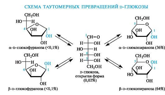 Таким образом, в растворе d-глюкоза существует в виде таутомеров: оксоформы и a- и β-аномеров пиранозных и фуранозных циклических форм.