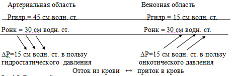 Согласно гипотезе Старлинга, в крови, в артериальной и венозной частях капилляров, соотношение между гидростатическим давлением, обусловленным работой сердца (45 и 15 см водного столба соответственно), и онкотическим давлением (30 см водного столба) различно. Разница давлений одинакова и составляет 15 см водн. ст., но в артериальной области преобладает Ргидр, а в венозной области – Ронк.