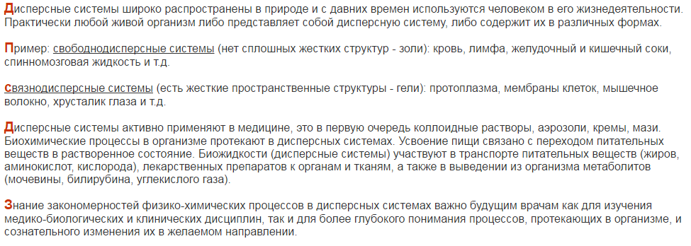 Коллоидные системы занимают промежуточное положение между грубодисперсными системами и истинными растворами. Они широко распространены в природе. Почва, глина, природные воды, многие минералы, в том числе и некоторые драгоценные камни, – все это коллоидные системы. Большое значение имеют коллоидные системы для биологии и медицины. В состав любого живого организма входят твердые, жидкие и газообразные вещества, находящиеся в сложном взаимоотношении с окружающей средой. С химической точки зрения организм в целом – это сложнейшая совокупность многих коллоидных систем.