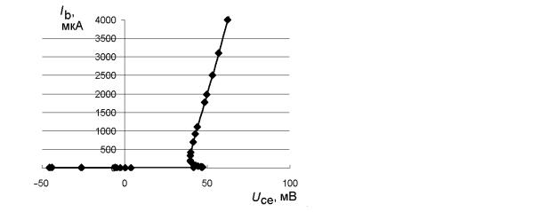 Снимаются зависимости напряжения коллектор–эмиттер от токов базы при фиксированных токах коллектора. Результаты измерений приведены на рис. 1.17. Сопротивление коллектора в нормальном активном режиме определяется в точках, расположенных поблизости от "выброса" кривых, для которых IC/Ib=const. Расчётная формула выглядит следующим образом: RC=∆Uce/∆IC. Для вычислений взяты следующие точки, соответ-