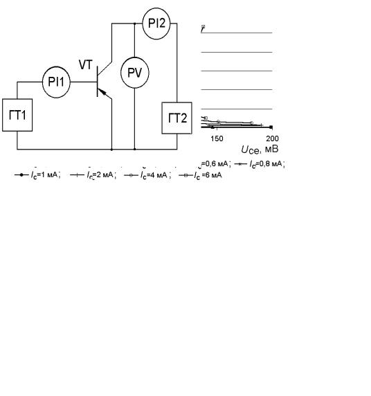 да; PI – измеритель тока базы Ib; PV – измеритель напряжения коллектор– эмиттер Uce. В качестве PI и PV использованы универсальные вольтметры В7-27. Измерение производится при нулевом токе коллектора. Током утечки вольтметра PV можно пренебречь из-за его высокого внутреннего сопротивления.